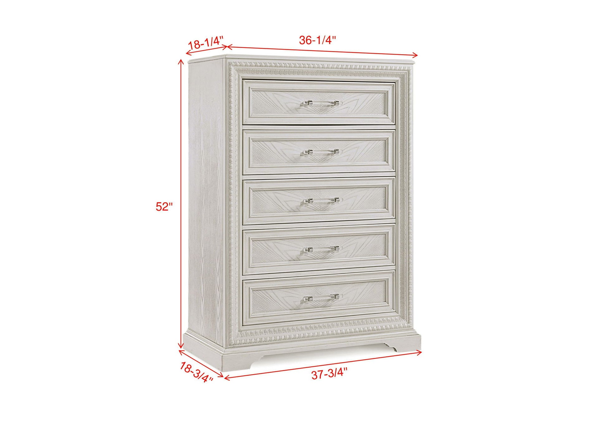 Introducing a bedroom collection that brings a breath of fresh sophistication to any living space. This suite boasts a bright, antique white finish that immediately brightens and opens up a room, providing a versatile foundation for any decor style. The bed's commanding headboard stands as a stately centerpiece, with architectural paneling details that convey a sense of sturdy elegance. Storage needs are gracefully met by the dresser and chest, each accented with refined drawer pulls that offer a subtle contrast and easy access.