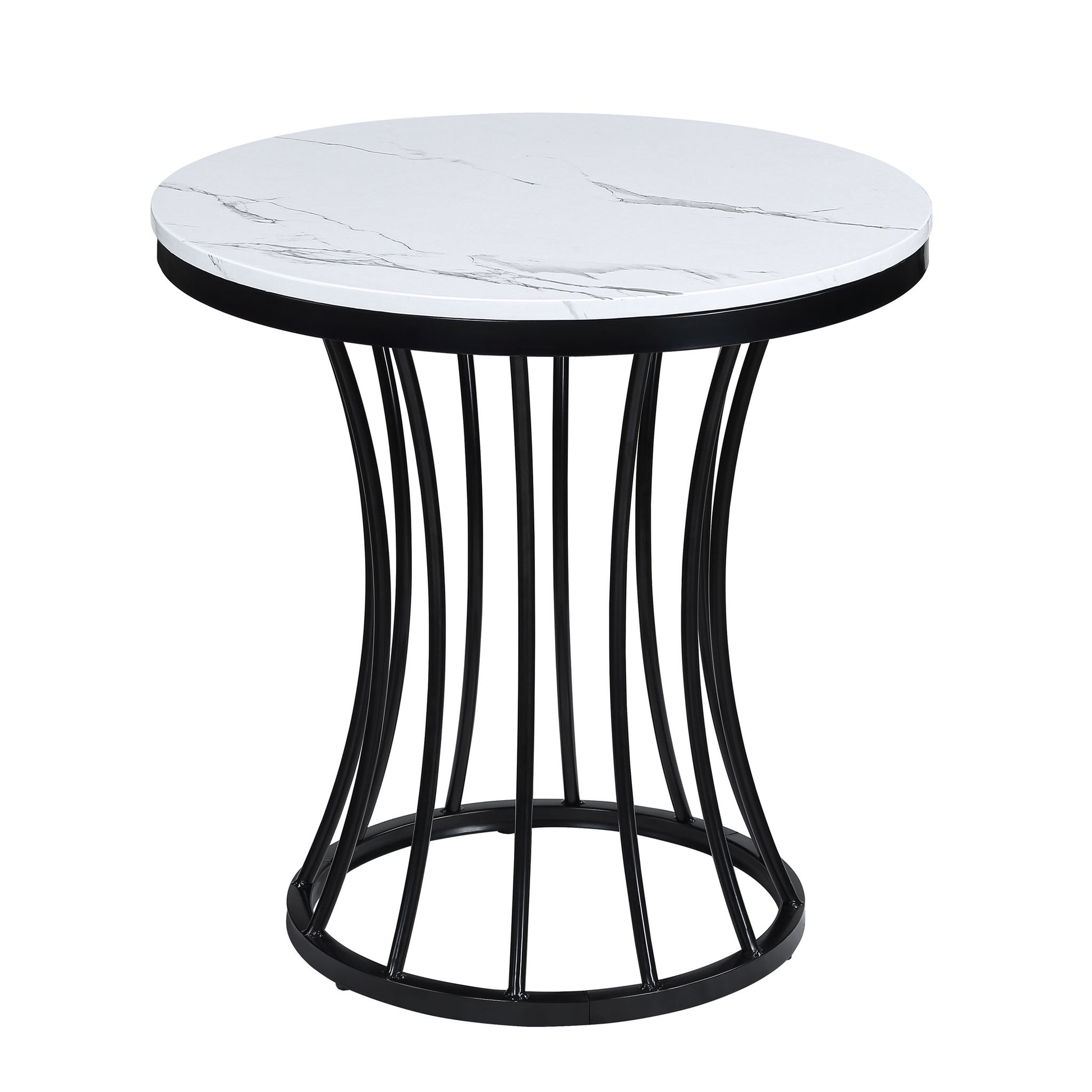 This cocktail set is a sophisticated blend of contemporary design and artistic flair, ideal for modern homes seeking a touch of elegance. The set features sleek, round tables with a faux marble tops that are both beautiful and easy to care for. Each table's base is a sculptural marvel, with a dynamic, cage-like structure that is as sturdy as it is stylish.