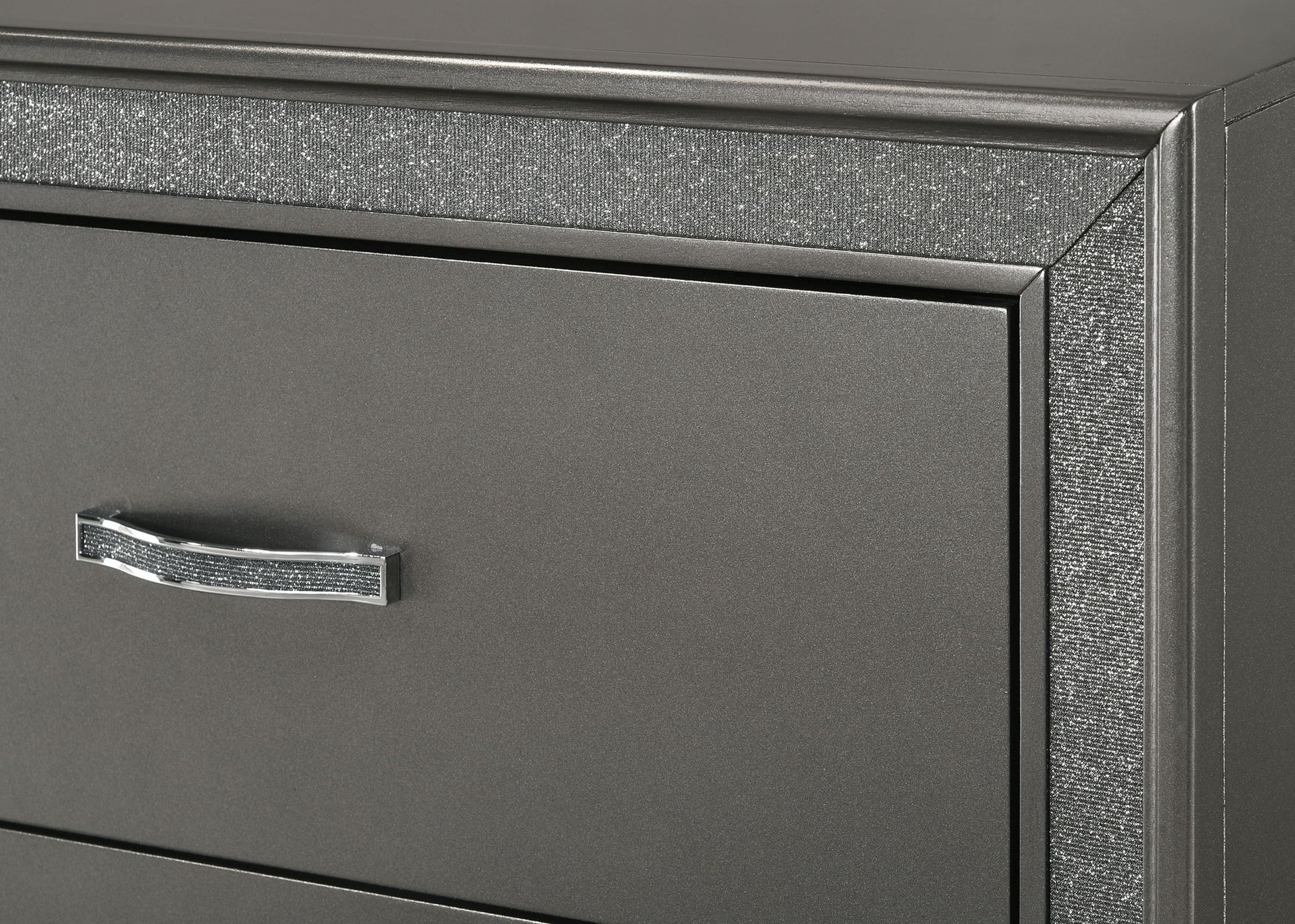 This luxurious bedroom collection exudes opulence with its dark, shimmering finishes and plush, tufted upholstery. The bed is a showstopper, featuring a high, tufted headboard that invites you to recline in comfort and style. Accompanying the bed are a matching dresser and chest, each boasting a sparkling trim that frames the rich, dark panels and complements the sleek, contemporary handles. The nightstand echoes the elegance of the bed, providing a convenient bedside space that doesn't skimp on glamour. Topped off with a generously sized mirror, the dresser completes this ensemble, reflecting both light and refined taste.
