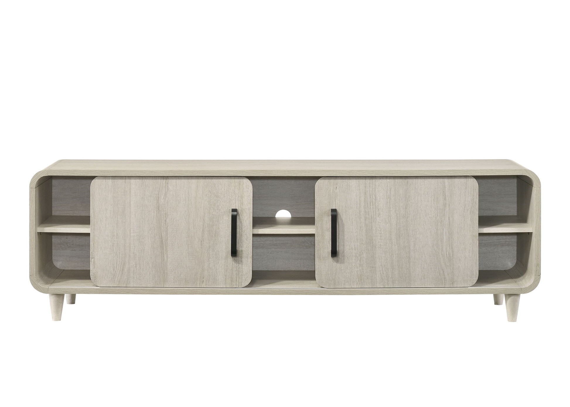 Elevate your living space with this sleek and contemporary entertainment solution that blends modern design with functionality. Featuring a streamlined silhouette and a chic, light wood finish, this piece exudes understated elegance while offering practical storage options. Sliding doors let you alternate between closed cabinets and open shelving, perfect for displaying décor or housing media devices. Enhanced with minimalistic black handles for a touch of contrast, this unit stands on tapered legs, adding a mid-century flair to its aesthetic. Whether you're setting up your home theater or showcasing your favorite accents, this centerpiece effortlessly combines style and utility to create a harmonious and inviting ambiance.